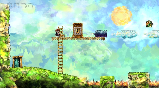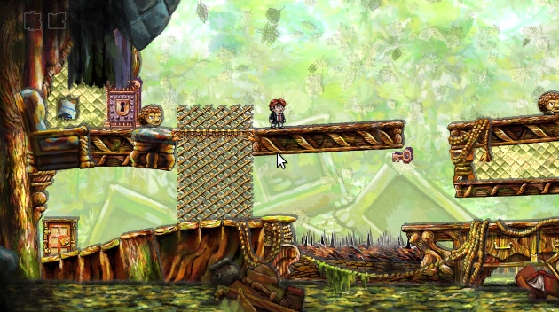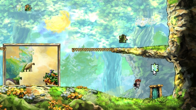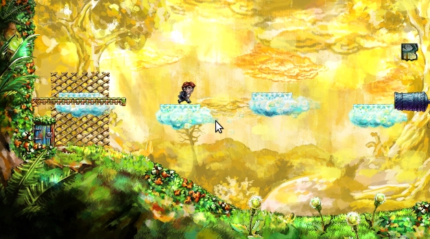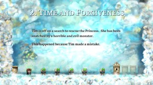 Mundo 2) Time and Forgiveness: Como é o primeiro mundo, você basicamente aprende como o jogo funciona, tanto as seções de plataforma quanto a mecânica de voltar no tempo.