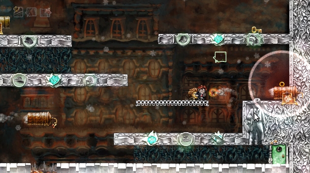 No geral, as fases de cada mundo são muito bem organizadas, e há uma sensação de que o jogo realmente está lhe ensinando mais sobre como usar cada uma das mecânicas do jogo, lhe dando as ferramentas necessárias para resolver cada um dos quebra cabeças até chegar ao momento “Eureka”, e normalmente nunca se tem a impressão de que o jogo está lhe pedindo para fazer algo que você não tem absolutamente nenhuma idéia de como resolver. Quase nunca, na verdade. Logo no primeiro (segundo) mundo, ou seja, no início do jogo, existem duas peças de quebra cabeça que estão fora do alcance de tudo que você aprendeu até então. Qualquer jogador que se preze, ao ve-las, primeiramente ficará um bom tempo matutando sobre como pegá-las, e, se deixá-las para trás, ficará com a pulga atrás da orelha e voltará lá mais tarde. E ficará feliz (ou puto) ao descobrir qual é a solução (não darei ela aqui só de sacanagem, bwahahahaha). Este é o tipo de jogo que Braid é.