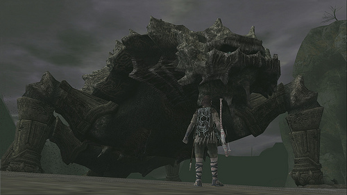 Uma coisa que já está ficando bem visível neste ponto da história é o fato de que, a cada colossus morto, o herói vai ficando mais cadavérico e sua espada, mais escura, o que é um provavel foreshadowing de futuros eventos (assim como o hentai rape que ele sofre por tentaculos negros a cada colossus que ele mata). Um adendo: se você clicar neste link anterior, prepare-se para perder um dia inteiro de trabalho/estudo/vagabundagem. Mas, voltando ao colossus: este é um colossus LaRgato, em uma espécie de coliseu. Meu primeiro movimento óbvio foi tentar lançar uma flecha nele, para ver o que ele faz. Ele olhou para cima e soltou seu projétil. De primeira eu pensei “Ei, até que não causa muito dano”. Isto é, até que a nuvem que permanece depois do tiro me matou! Segunda morte em SotC.