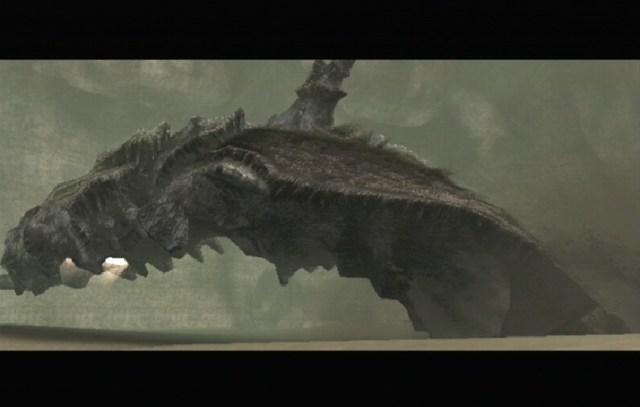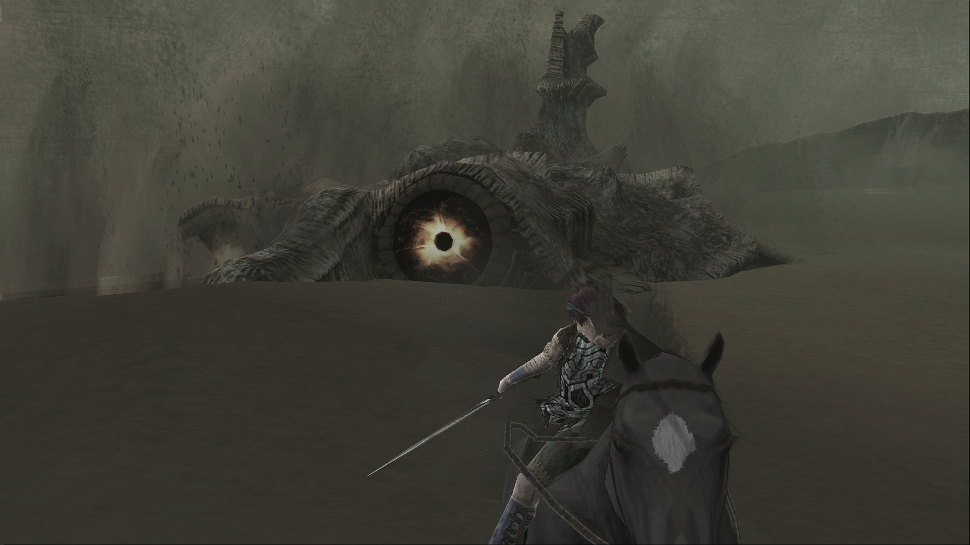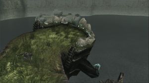 Com a queda, o bicho perde a carapaça das costas, mostrando seu ponto fraco. Tento (ousadamente) pular direto de cima do desfiladeiro nas costas do bicho. Até consigo, mas não me segurar. Fico rodeando o bicho mas não consigo de jeito nenhum subir nele. Menos mal que ele causa pouco dano. Até que uma hora por sorte subo, mas não consigo ficar numa posição boa para causar dano nele, causando praticamente nada. Engraçado que, quando você monta nele, ele, por alguma razão, sempre tenta subir pelo caminho estreito. Caio e fujo do corredor, onde fica ruim para eu rodeá-lo. Ele vem atrás, e logo me dá uma chifrada que me faz voar longe, de uma maneira que só pode ser descrevida como patética. Porém, logo é a minha vingança: subo de novo e desta vez me posiciono bem. Poucas porradas depois, tchau e benção colossus.