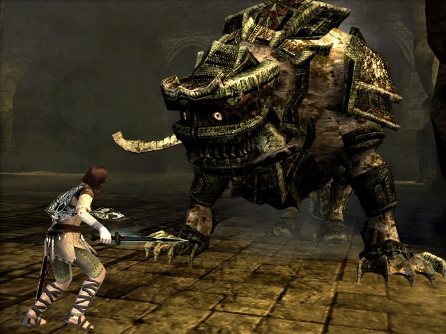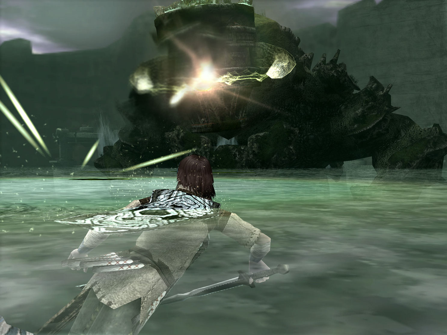 ico um tempão em cima dele esperando ele chegar perto e nada, nesse interim fico brincando para passar o tempo, e em uma dessas acerto um dos “dentes bizarros” que ele possui em cima da cabeça (sim, eu sei, dentes em cima da cabeça). Ele ressoa e o bicho anda na direção batida. Faço ele andar até a estrutura, pulo nela e me escondo atras de um mondrongo (amazones for the win x2). Ele me ataca com o raio e depois põe as duas mãos na estrutura, mostrando o alvo na sua barriga. Pulo lá, tiro metade da energia dele, repito o processo e adeus colossus.