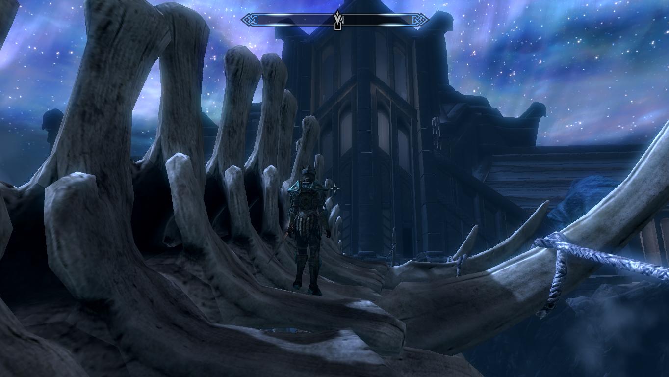 Depois você pode pegar o cetro do chefe e colocar num buraco no chão, para abrir um teleporte para Sovngarde. O local é cheio de névoa, mas fui seguindo o caminho de pedra e cheguei num palácio gigante, com uma ponte feita com o esqueleto de um dragão. O level desing aqui é muito bonito, fiquei até um tempinho admirando.