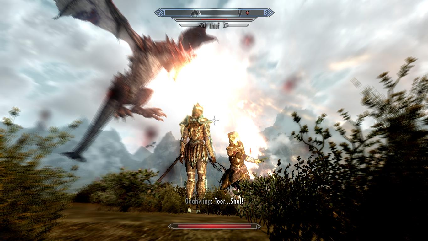 Quando terminamos o serviço, Alduin aparece. Penso comigo mesmo, “Ah, se eu te pego”. Amaldiçoando o Michel Teló, resolvo descontar minha recém adquirida fúria no dragão. Espero ele se posicionar para usar o bafo e cuspo-lhe um Dragonrend na cara. Quando o bicho pousa, eu e os outros heróis fazemos um montinho digno de quando-caia-um-gordinho-no-ensino-médio.