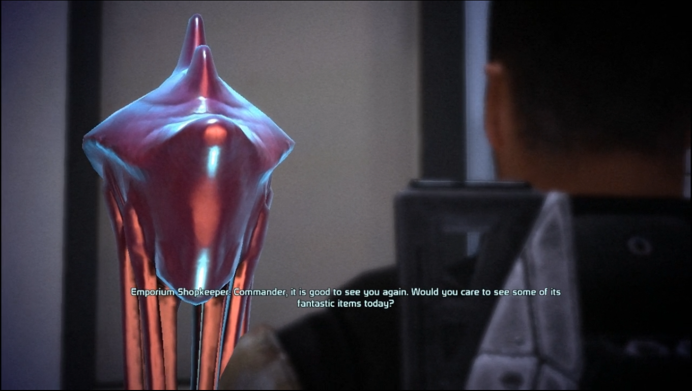 Explorando um pouco pela cidade, encontro o soldado Orella Fredricks. Após seu agradável “o que você quer?” eu o questiono sobre quem diabos é a tal consorte Asari de quem ele estava falando (enquanto penso em seu destino promissor, que nem o de Jenkins). Ele explica que é uma Asari que trabalha como… tipo, ela ajuda pessoas com… bem, problemas. E que custa muito dinheiro para… falar com ela. Já o barman me explica que Sha’ira (a consorte) entretém os clientes que podem pagar por seus serviços… Hum, acho que ela deve ser comediante stand up.
