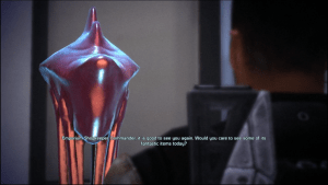 Visitando a torre onde teremos o encontro com o conselho, conheço Garrus, um investigador alienígena que quer desmascarar Saren. Será que ele vai entrar pro meu grupo ¬¬? Bem, ele me deseja sorte na conferência, eu dou meia volta e vou embora. Pô, não quero avançar o enredo ainda, fiquei curioso para encontrar a… consorte.