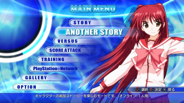 Não importa que personagem você escolha, a trama é basicamente a mesma. No Story Mode normal a missão é derrotar Ma-ryan Senpai – uma personagem de To Heart 2, que criou por acidente uma água mágica chamada Aquapazza (que é “água da loucura” em italiano…por que italiano?) que tem a habilidade de controlar os sentimentos alheios e, aparentemente, pode fundir mundos também. Exclusivo para a versão console, existe o Another Story Mode. Você libera essa modalidade para cada personagem que completou o story mode original. Nesse modo, o herói do primeiro story mode volta a viajar através dos mundos para impedir que Chizuro de Kizuato libere os poderes de “Yata no Kagami”, um espelho amaldiçoado que pode realizar desejos.