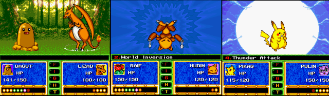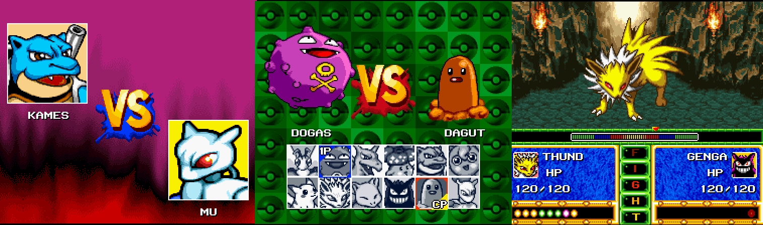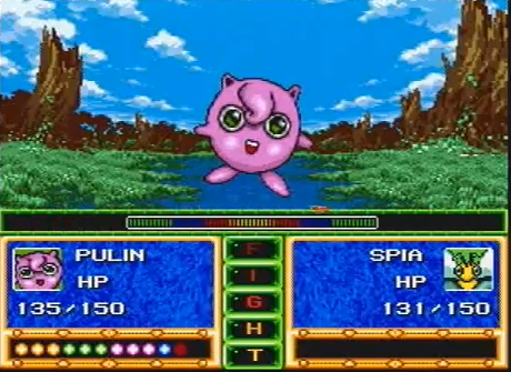 Aqui shit hit the fan com força. Os mais atentos devem ter notado que no gênero do jogo eu coloquei “YuYu Hakusho“. Para os que não conhecem, não vou queimar cartucho agora (reviews futuras), mas o sistema deste Pokemon é como se fosse uma versão (extremamente) simplificada dos jogos do Detetive Espiritual. Uma vez que um combate se inicia você deve pressionar o direcional para baixo. Quanto mais tempo você o mantém pressionado maior será a energia carregada. Uma vez que tenha carrega energia suficiente para um ataque aperte ”A”, e selecione o ataque, bem simples.
