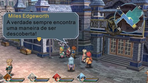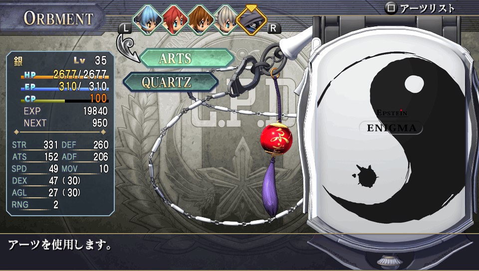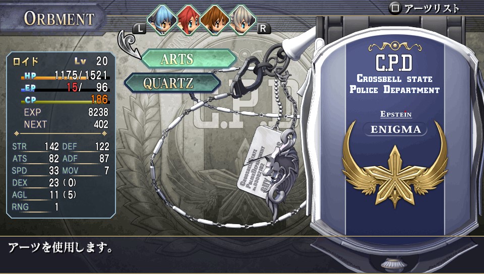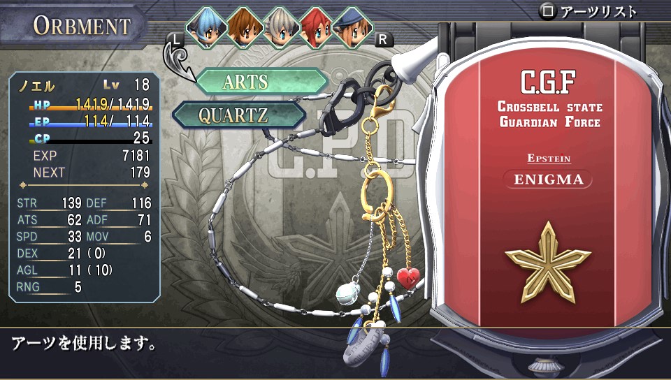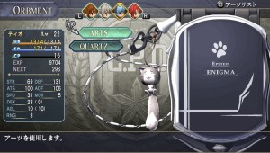 O jogo conta com o sistema de Orbments, que é como uma espécie de sistema de matéria do Final Fantasy VII evoluído, você coloca pedrinhas mágicas chamadas “Quartz” dentro de um estojo chamado Enigma, dependendo do nível, elemento e propriedades do Quartz, ele concede diferentes bônus e magias para o usuário. O legal é que você de fato vê onde ficam essas malditas pedrinhas, o menu onde você ajusta os slots é na verdade o seu Enigma aberto, ele é até útil em alguns eventos já que os policiais usam como distintivo, você pode até mesmo comprar enfeites e capas pra eles, cada personagem tem o seu personalizado, exceto o Dudley, por que ele é muito sem-graça! BUUuuu!