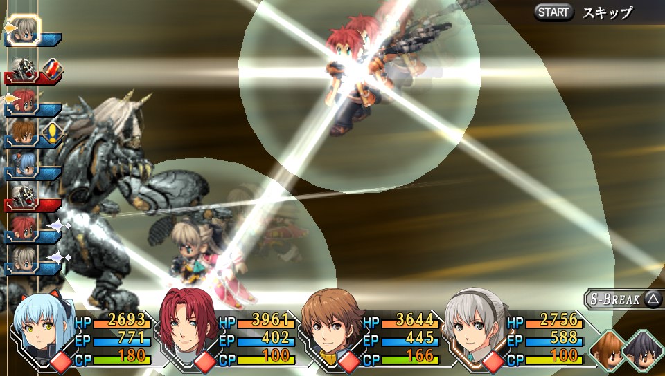 O sistema de batalha desse jogo se parece muito com o de jogos lendários como Grandia e Lunar, você pode até mesmo mudar a câmera para ficar mais parecido com esses clássicos. O campo é dividido em grids, que facilitam marcar quantos passos cada personagem pode andar quando ataca. Uma barra vertical com as ordens dos turnos fica no canto esquerdo da tela, ao lado de uma barra de bônus como ataque crítico, turno extra, cura e até mesmo uma chamada para atacar com os 4 de uma vez. Magia gasta EP, que só se recupera com itens, e Craft são habilidades exclusivos de cada personagem e precisam de CP para serem executados. Nada brilhante aqui, mas não há nada de errado também, algo muito raro nos RPGs de hoje.