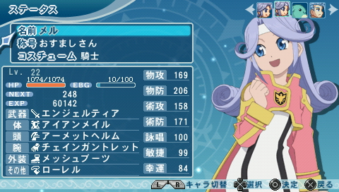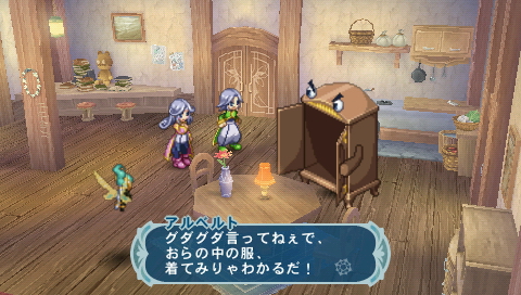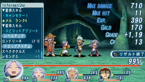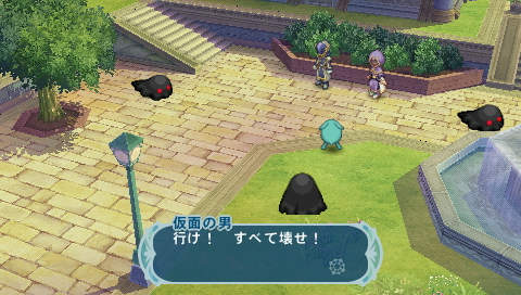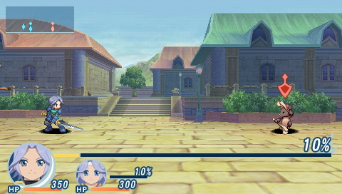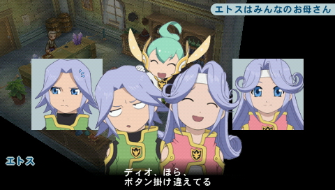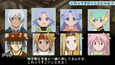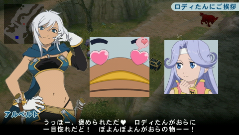 Um pouco melhor do que o 2D de Tales of Hearts para Nintendo DS (que eram muito “Super Deformados”), mas a melhor resolução de tela do PSP faz a diferença parecer maior. O ambiente é poligonal mas você não pode ajustar a câmera. Algumas roupas são parecidas umas com as outras, mas ainda tem umas boas diferenças gráficas.