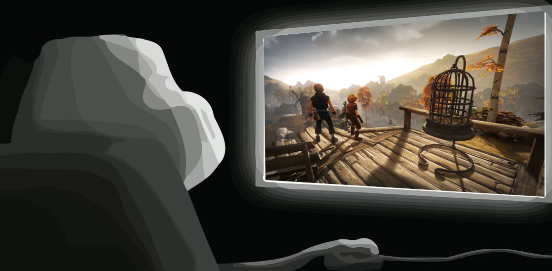 Por isto, neste mês, escolhi comprar um jogo indie: Brothers: A tale of two sons. Jogo indie, menor, que é basicamente uma aventura meio estilo Ico, com exploração, plataforma e vários puzzles, onde você controla dois irmãos… Com um ligeiro twist: Você controla ambos ao mesmo tempo, um com cada analógico! Sim, isso mesmo, um jogo co-op para quem não tem amigos!