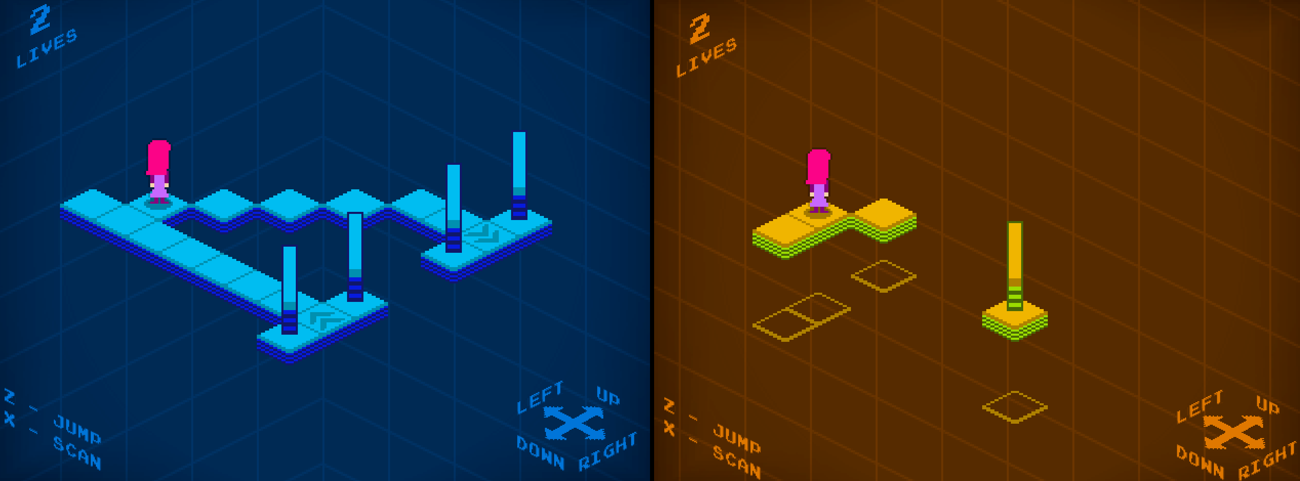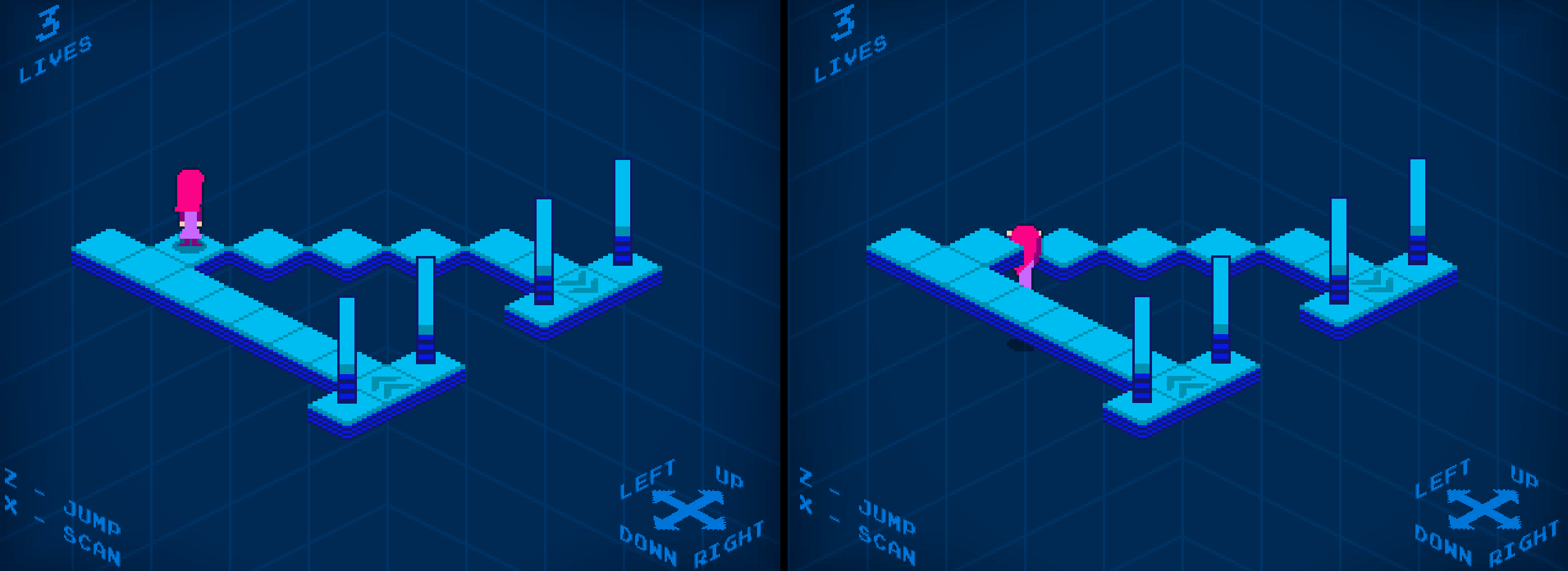 Para auxiliar o jogador nesta confusão, logo no início do jogo ele ganha um scanner, que mostra exatamente quais plataformas estão no eixo em que o jogador se encontra no momento, e em que altura elas se encontram, através de algumas sombras que aparecem no chão. Com isto, o jogo se torna na prática uma exploração de como um mapa isométrico pode fuder com a sua cabeça, com o jogador tentando ao máximo entender qual o real layout da sala.