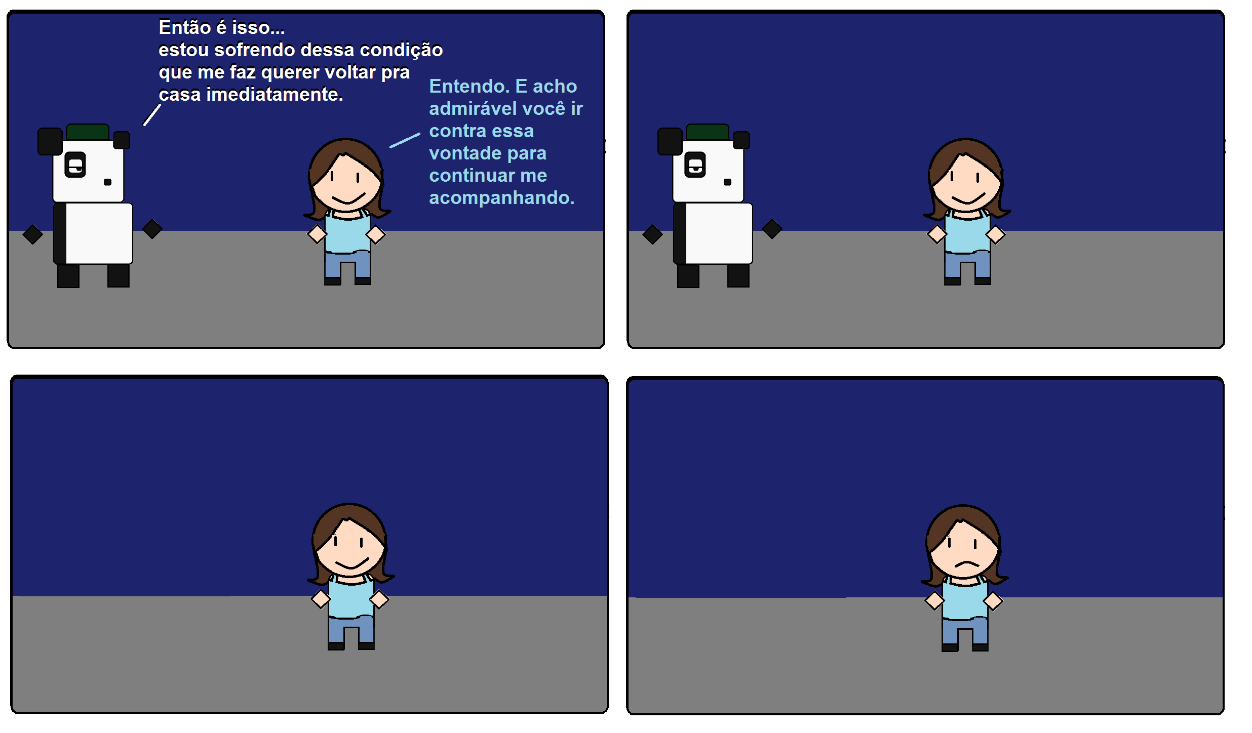 No fim das contas aquele imprevisto daria inicio a um relacionamento de benefícios mútuos: ela teria alguém que a acompanhasse até sua morada e eu teria alguém que faria minha ligação com as demais pessoas da sala, me poupando do exaustivo ritual de comunicação, tão temido por pessoas anti-sociais como este que vos escreve.