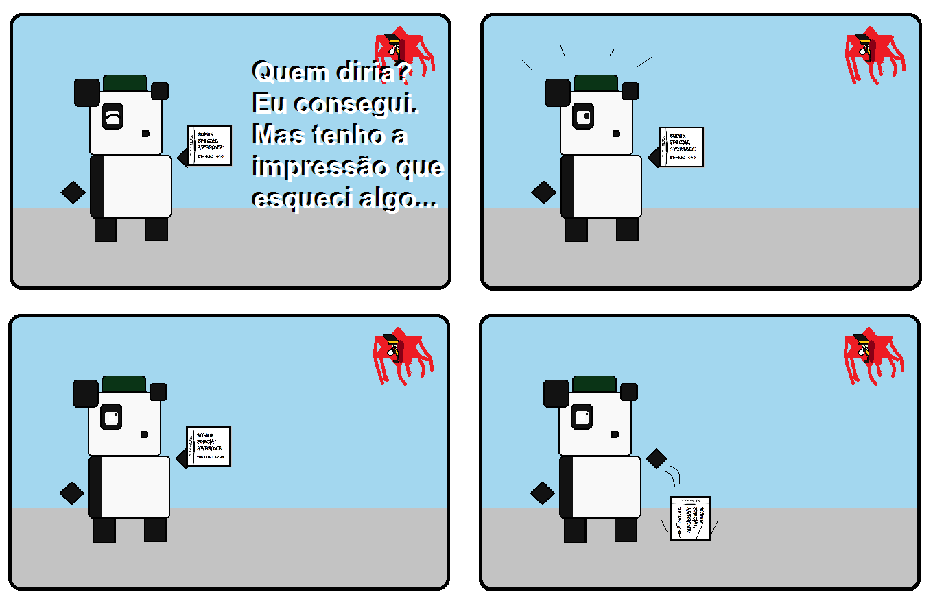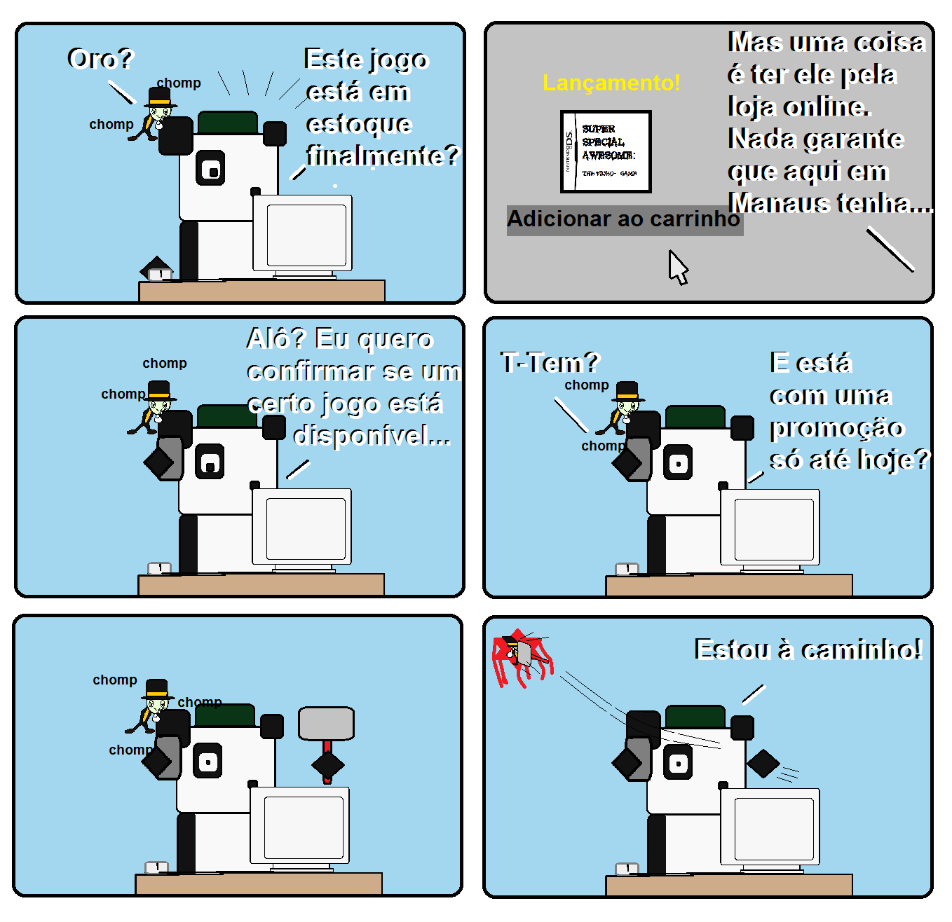 Já tendo tido meu reservatório de culpa avariado pelo inseto invasor, eu começava a conjecturar a possibilidade de retornar à faculdade, apenas para que eu pudesse levar minha amiga em segurança até sua casa. Afinal se algo acontecesse à ela naquele dia, seria minha culpa por ter negligenciado minhas responsabilidades. Sentei-me à frente de meu computador, numa tentativa de me distrair dos pensamentos negativos que estavam multiplicando-se rapidamente. Foi então que recebi um e-mail de uma certa grande rede de livrarias, anunciando que um jogo que esperava à meses havia entrado em estoque.
